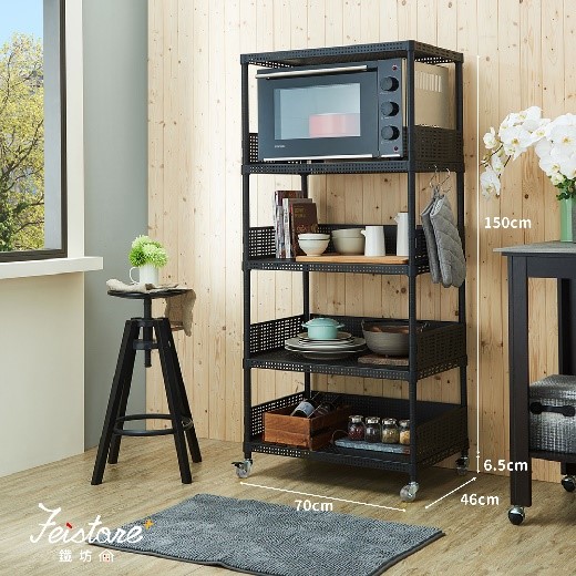 | 五層架: 適合需要更多收納空間的家庭,層高可調整,用於擺放大件物品如微波爐、鍋具等。 | 範例圖示: