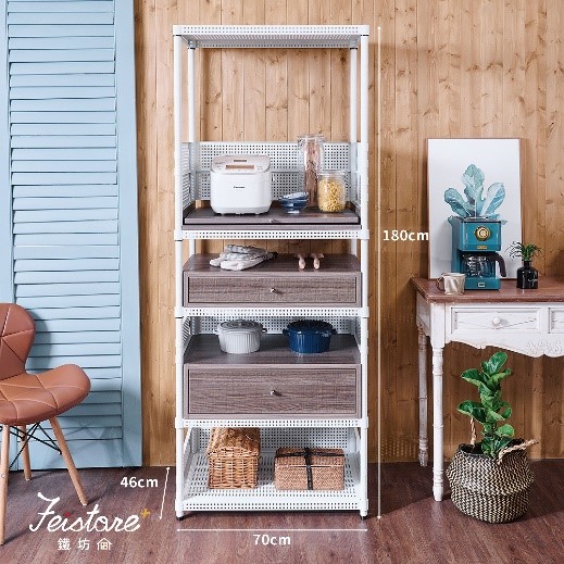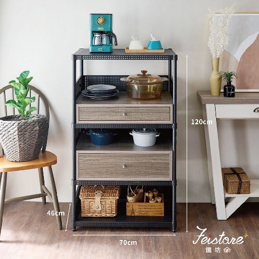 | 抽屜式+抽拉盤五層架: ➤抽拉盤本身使用高密度耐磨防潮特等木心板製成,可耐重20KG,防潮耐高溫。 ➤層板間距可以自由調整且單片層板耐重150KG。 |