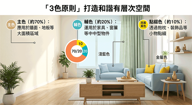 - 輔色(約20%):運用於家具、窗簾等中型物件,如淺木色、淺藍或淺綠,增添溫潤氛圍。