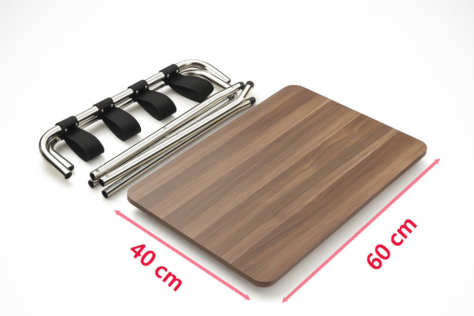 材質: 高硬度鐵管 (表面電鍍處理)、質感木紋板、高強度織帶