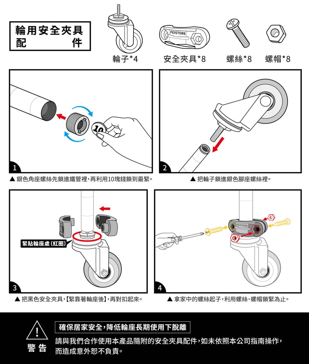 ◈ 此組輪隨附【安全夾具】請依照公司指南操作,當重物在長期推動下,可減少管徑變形(擴孔)之風險。